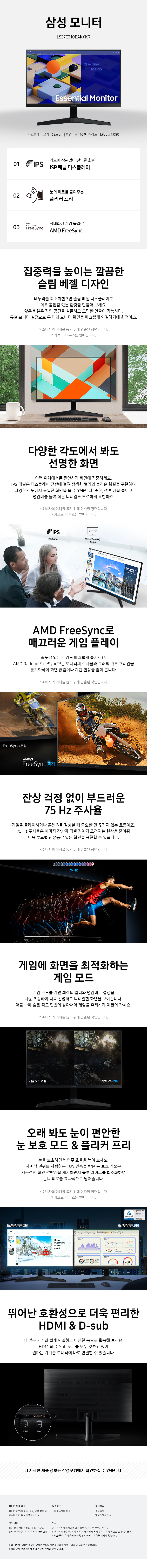 68.6cm(27인치) / 와이드(16:9) / IPS / 평면 / 광시야각 / 1920 x 1080(FHD) / 픽셀피치 : 0.3114mm / 최대 주사율 : 75Hz / 5ms(GTG) / 250cd / 1,000:1 / 플리커 프리 / 블루라이트 차단 / HDCP 지원 / 틸트(상하) / 100 x 100mm / 25W / 크기(가로x세로x깊이): 612x463x217mm / 3.8kg /[색상영역] NTSC : 72% /[게임특화] 게임모드 지원 / FreeSync /[단자정보] HDMI / D-SUB